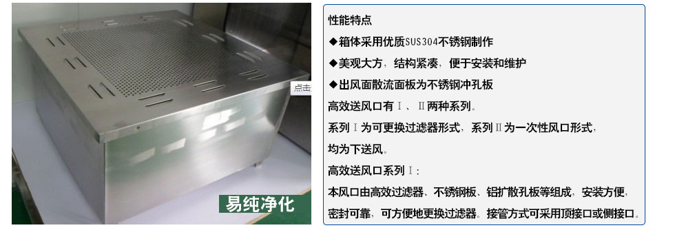 高效送風口為千級、萬級、十萬級凈化空調系統較為理想的終端過濾裝置,可廣泛于醫藥、衛生、電子、化工等行業的凈化空調系統。高效送風口是用作改造和新建1000-300000級各級潔凈室的終端過濾裝置,是滿足凈化要求的關鍵設備。高效送風口包含靜壓箱,散流板,高效過濾器,與風管的接口可為頂接或側接