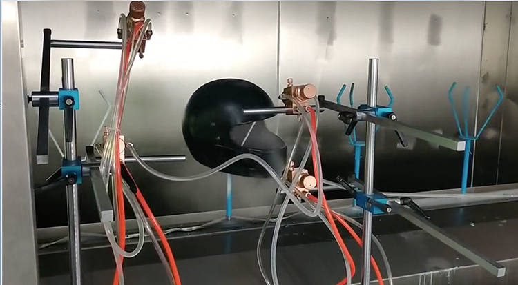 頭盔的生產(chǎn)采用塑料粒子經(jīng)過高溫熔化,經(jīng)過壓塑機(jī)的模具成型,然后經(jīng)過冷卻、上架。這個(gè)是頭盔的成型階段,成型的頭盔都是一種顏色,但實(shí)際我們市場采購和銷售的頭盔都是五顏六色,有各色花系的,這個(gè)就是本文提到的后期自動(dòng)噴漆線的工藝流程,下面詳細(xì)圖文介紹凈化噴漆線的作用及安裝實(shí)際案例介紹。
