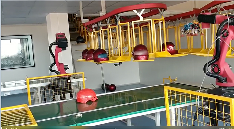頭盔正在自動(dòng)線上噴漆